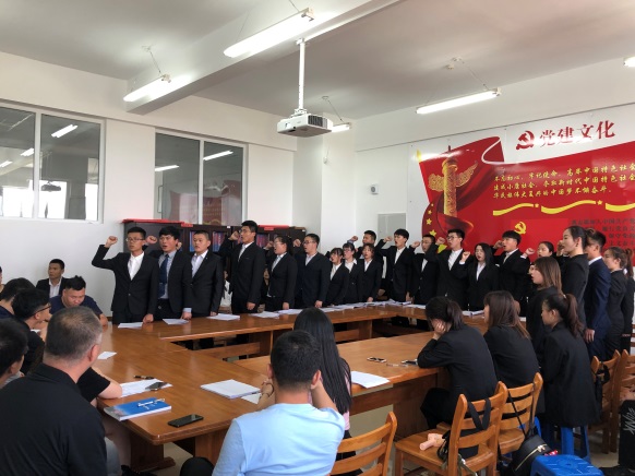 由正式党员韩蛟带领徐希平等22名同志进行入党宣誓:“我志愿加入中国共产党,拥护党的纲领,遵守党的章程,履行党员义务,执行党的决定,严守党的纪律,保守党的秘密,对党忠诚,积极工作,为共产主义奋斗终身,随时准备为党和人民牺牲一切,永不叛党。”