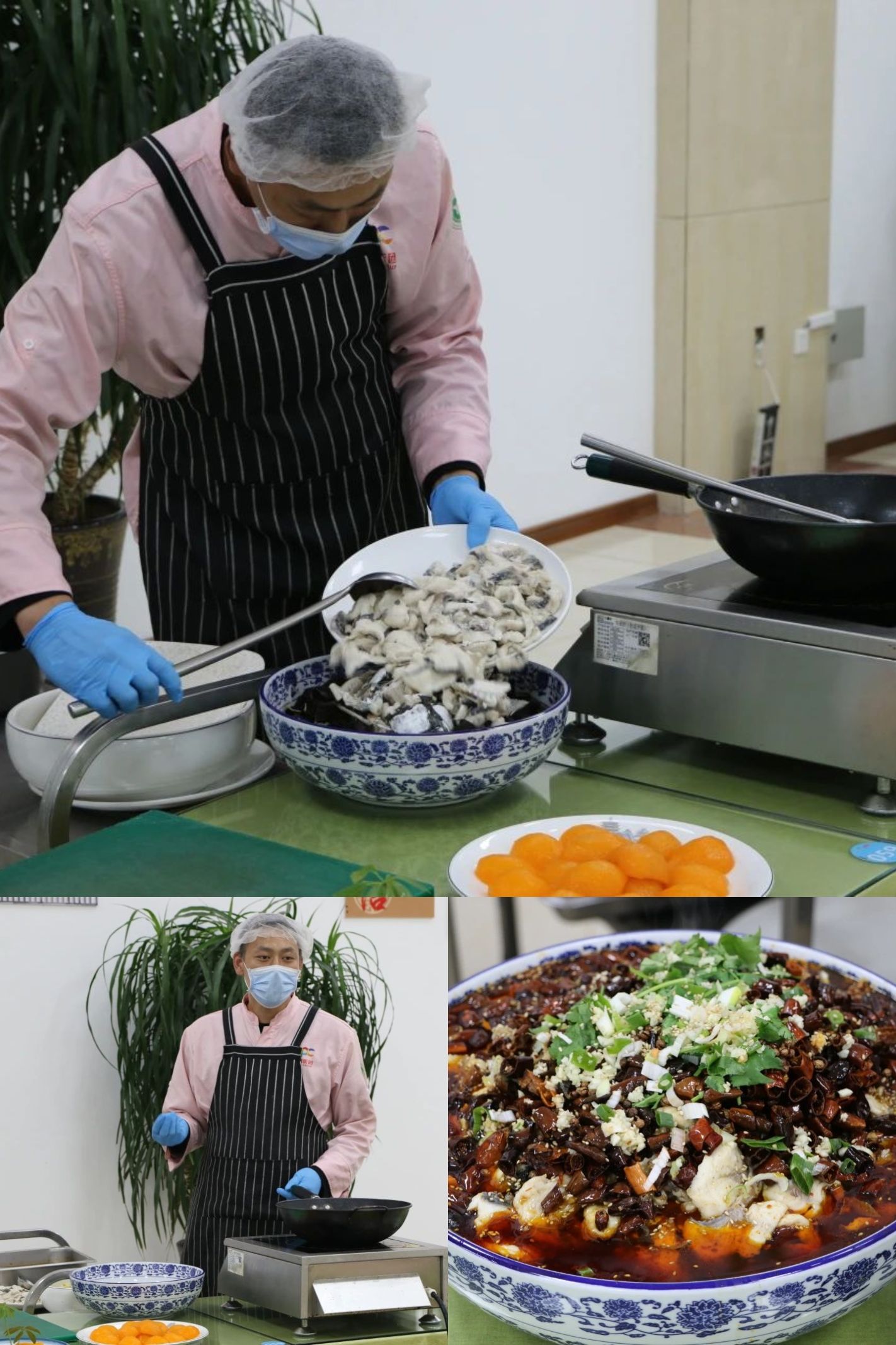 食堂厨师朱先生为我们现场展示制作了“水煮鱼”。