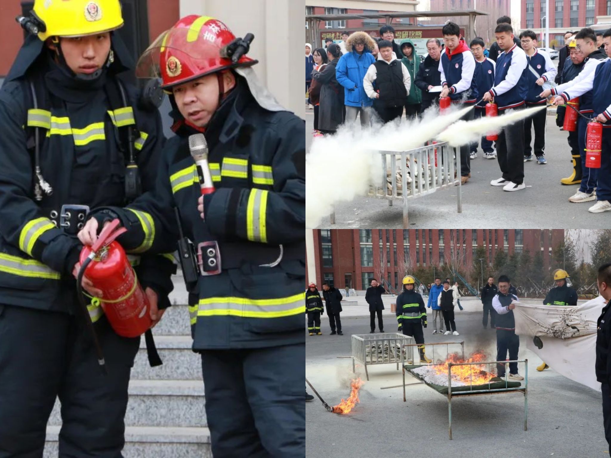 消防逃生疏散演练结束后,消防官兵向全体同学讲解宿舍用电注意事项和灭火器的使用方法,学生们在消防官兵的指导下亲自操作。