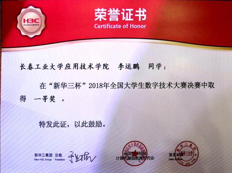 2018年11月30日至12月4日,由紫光旗下新华三集团和全国高等院校计算机基础教育研究会联合主办的2018年“新华三杯”全国大学生数字技术大赛全国总决赛在杭州举行。我院网络技术专业5名同学在参加总决赛的200名选手(本科、专科学生各100名)中,表现出色,经过激烈角逐,最终取得了高职组(李运鹏、倪凯)一等奖1项、三等奖1项、本科组(冯伟鹏、徐希平、郭伟)三等奖3项的好成绩。
