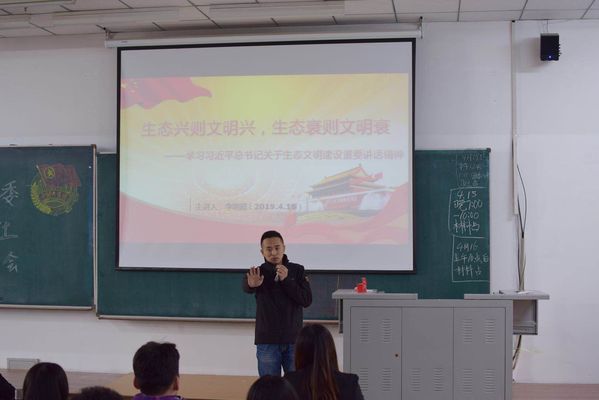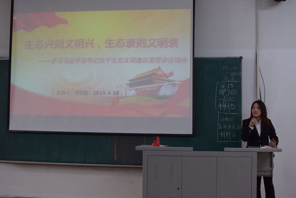 生态环境是关系党的使命宗旨的重大政治问题,也是关系民生的重大社会问题。宣讲一开始,李明超老师由生活中的小事引入主题,生态兴则文明兴,生态衰则文明衰 。生态文明建设是中国特色社会主义事业的重要内容,也是经济持续健康发展的关键保障,它关系着人民福祉、关乎民族未来的长远大计,是民意所在民心所向。同时举出身边乱扔垃圾、踩踏草坪、浪费水纸等现象。提出不要只有口号不做实际,应该坚持。并且拿自身举例,承诺尽量少开私家车,坐公交车,并且每年春天,捐钱种树,节约资源,发扬前人栽树、后人乘凉精神,为我们的后代考虑,加强森林管护,推动国土绿化不断取得实实在在的成效。