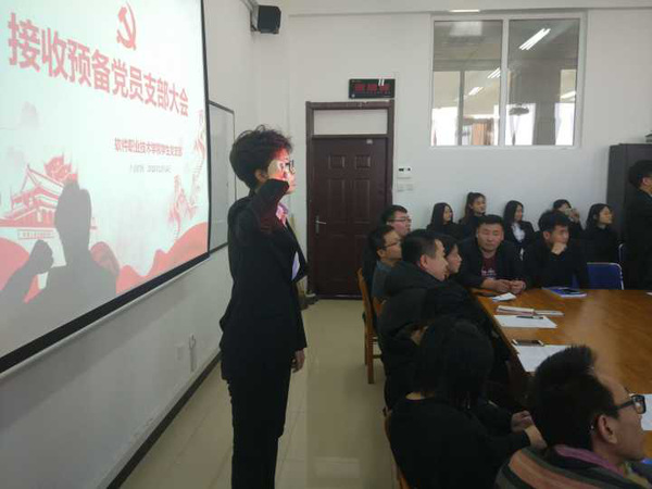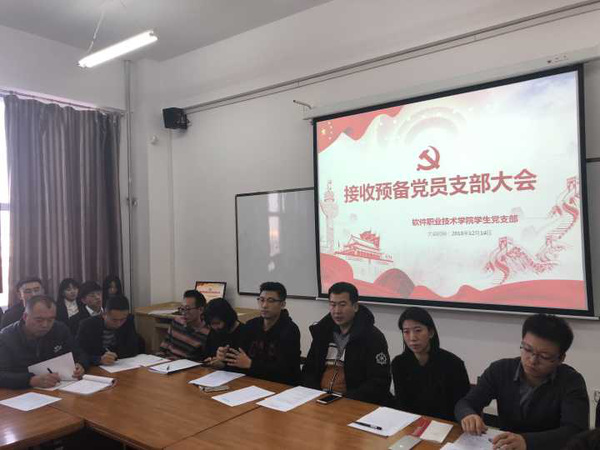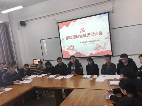 新闻通讯(通讯员 程鑫钰)为讨论接收韩贤喆等25名同志的入党问题,软件职业技术学院于2018年12月14日在应用楼413举行了接收预备党员支部大会。由学生党支部书记孔若冰老师主持本次大会。