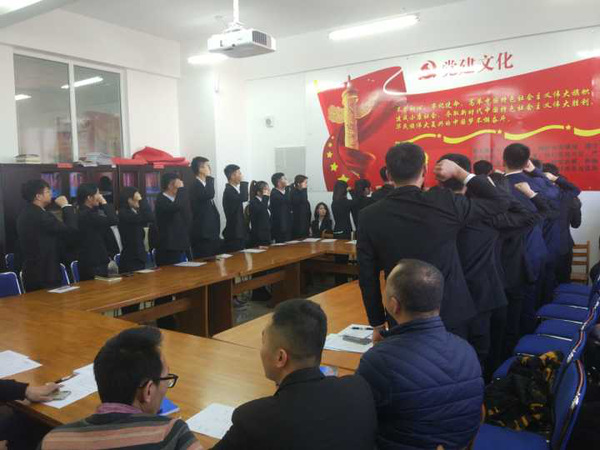 最后是预备党员表态,表明入党决心,并且由正式党员孙可欣同学代领预备党员面对党旗宣誓:我志愿加入中国共产党,拥护党的纲领,遵守党的章程,履行党员义务,执行党的决定,严守党的纪律,保守党的秘密,对党忠诚,积极工作,为共产主义奋斗终身,随时准备为党和人民牺牲一切,永不叛党。
